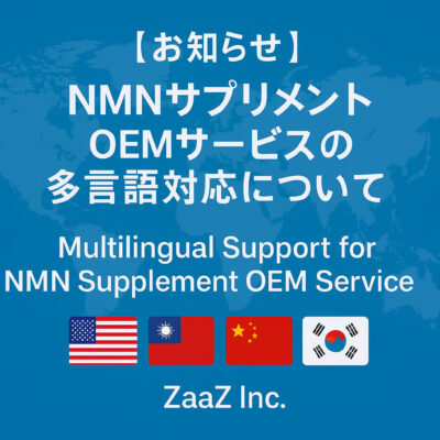 NMN(ニコチンアミド・モノヌクレオチド、略称:β-NMN)サプリメントの、受託製造(OEM)を行っております。『いいものを安く、そして早く。』をコンセプトとして、大容量のNMN 36,000mg、スタンダードな15000mgや9,000mgなど、様々なクライアントのNMNサプリメントを製造しております。最小ロットから大ロットは150,000個まで対応しております。納期は最短1ヶ月の短納期。原料は酵母を丁寧に発酵させながら作られたNMN(無香料/無着色)を使用して、国内GMP認定工場で製造を行っております。ご要望に応じた容量も承っております。御社にもご満足いただける自信があります。何卒ご査収ください。